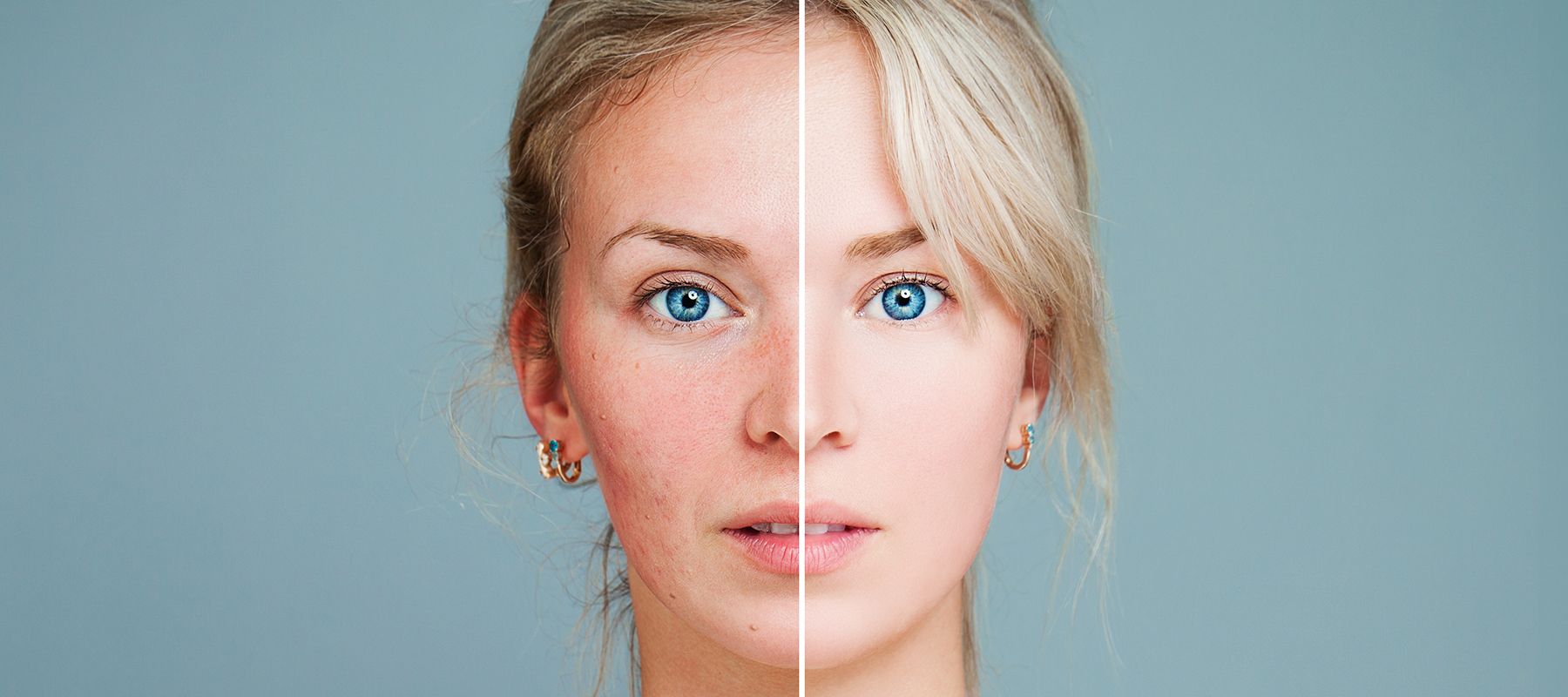 Si bien ambos se caracterizan por enrojecimiento, manchas rojas (pápulas) y manchas blancas (pústulas) en el rostro, el acné también se caracteriza por la presencia de puntos negros (comedones) y puede causar cicatrices y marcas (hiperpigmentación postinflamatoria). La presencia de vasos pequeños es específica de la rosácea. La edad del paciente también puede guiar el diagnóstico, ya que el acné es muy común en los adolescentes. Por último, el acné puede afectar a otras partes del cuerpo (torso, espalda), mientras que la rosácea solo afecta a la parte central del rostro.